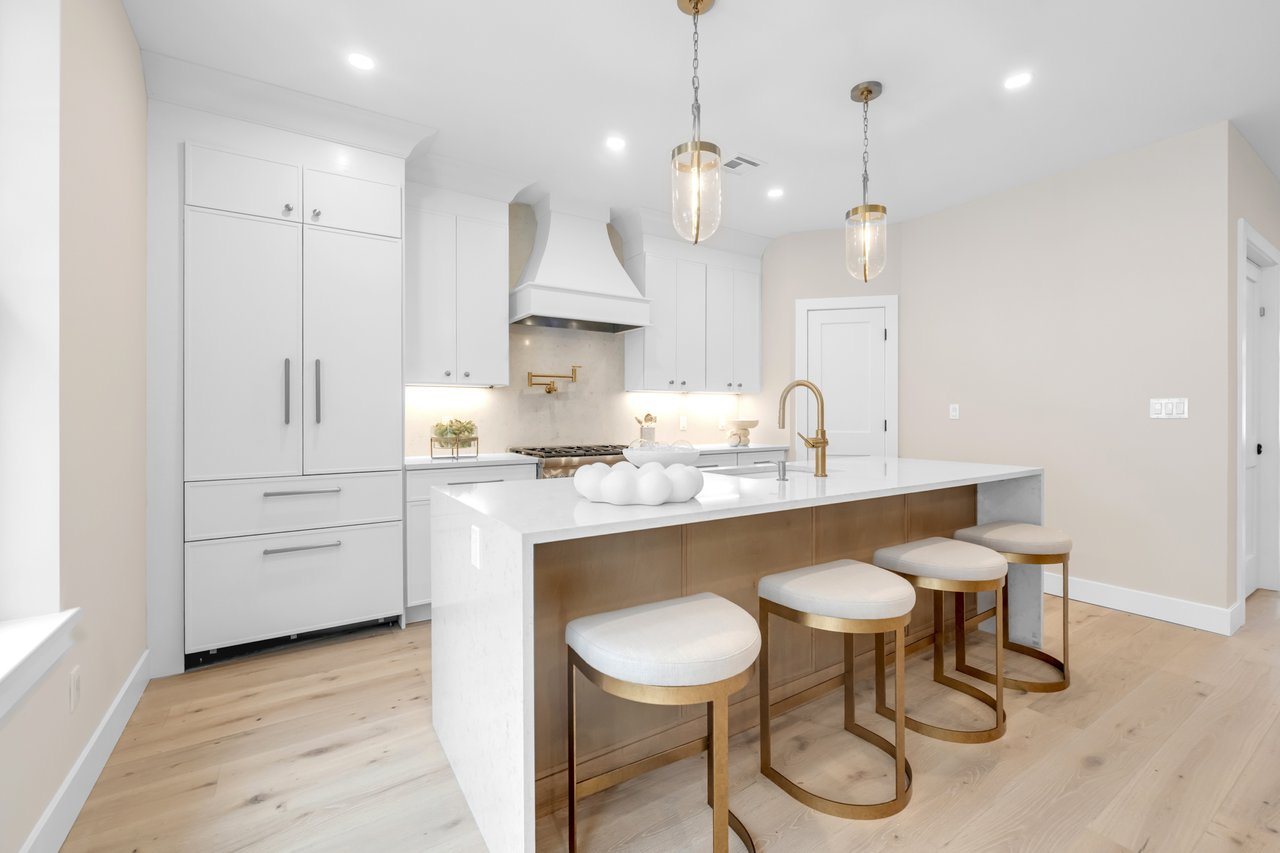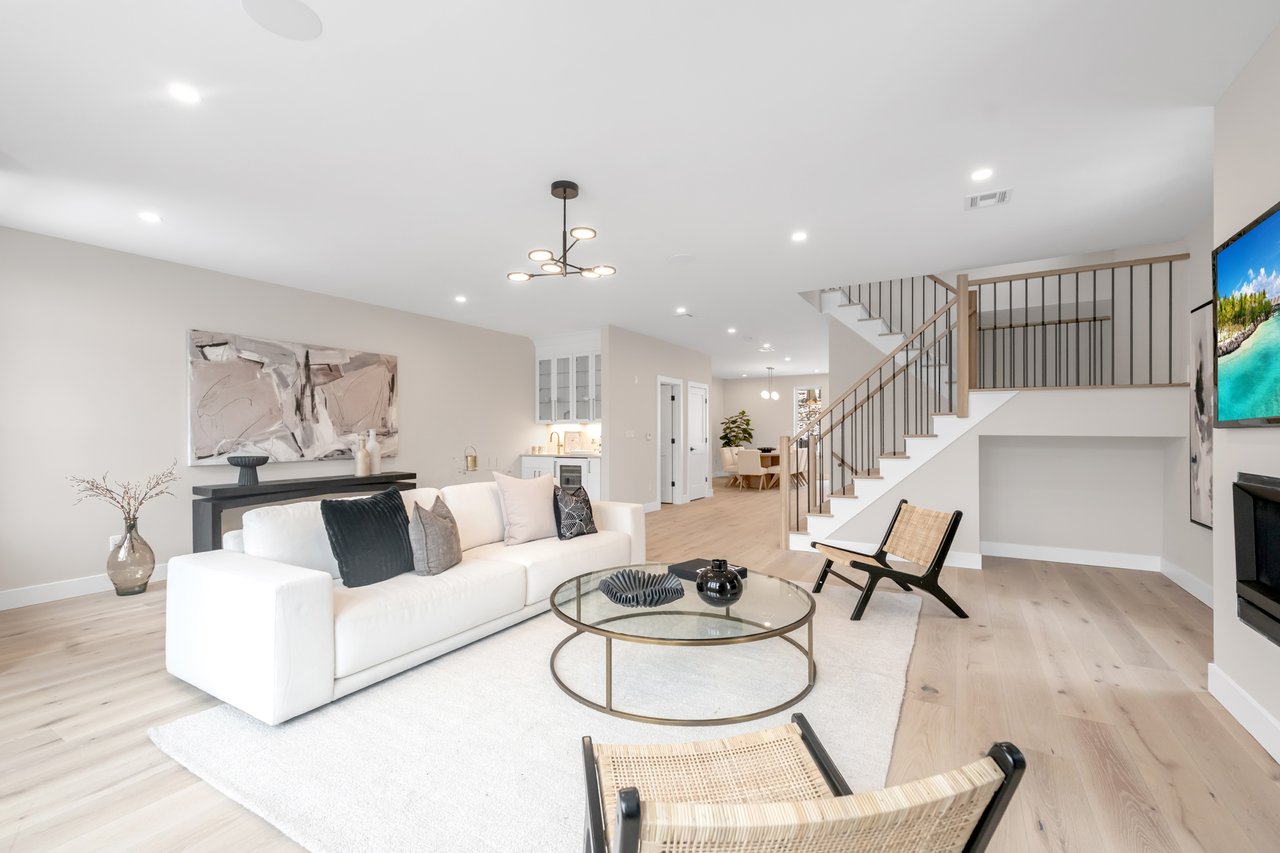 Finished with carefully curated high end materials, including Thermador appliances, custom cabinetry, quartz countertops, wide plank oak flooring, and designer details throughout. The ground level offers a finished recreation room with a half bath and access to a covered patio. The main living level is designed for seamless everyday living and entertaining, showcasing an open concept layout with a gas fireplace, wet bar, chef's kitchen centered around a waterfall quartz island, dining area, powder room, and access to a private deck. The upper level is met by a spacious primary suite with two walk in closets and a spa inspired bath, along with two additional bedrooms, a full bathroom, and a dedicated laundry area.